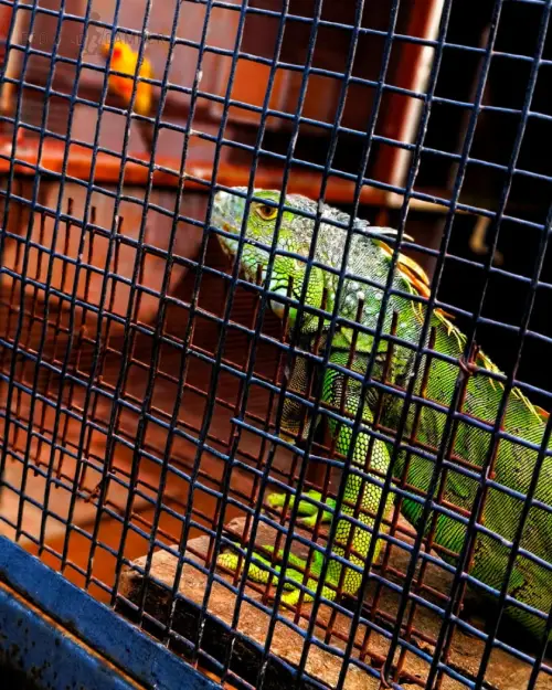 Iguanas are naturally shy, solitary reptiles with highly specialized needs. Frequent handling in a noisy petting environment causes significant stress, which can weaken their immune system and trigger harmful behavioural changes. They also require precise temperature gradients, high humidity, and UV lighting to stay healthy, conditions nearly impossible to maintain in an open farm setting. Moreover, iguanas can carry Salmonella, putting visitors, especially children, at real risk.